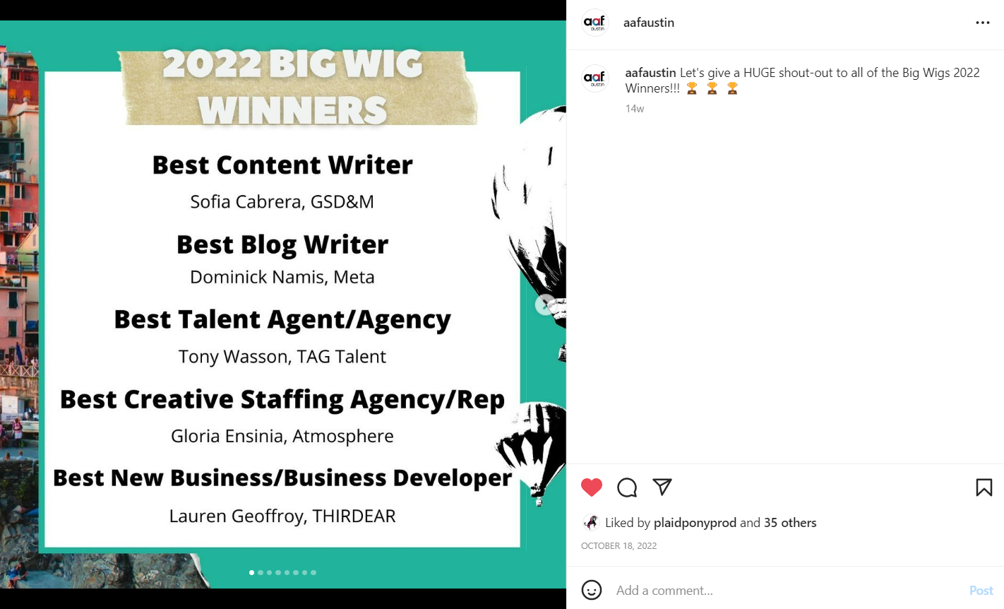 The American Advertising Awards 2023 AAF Austin Happy Hour Big Wigs Awards 2022 Inclusion Solutions Stephen’s Place Big Wigs Awards 2021